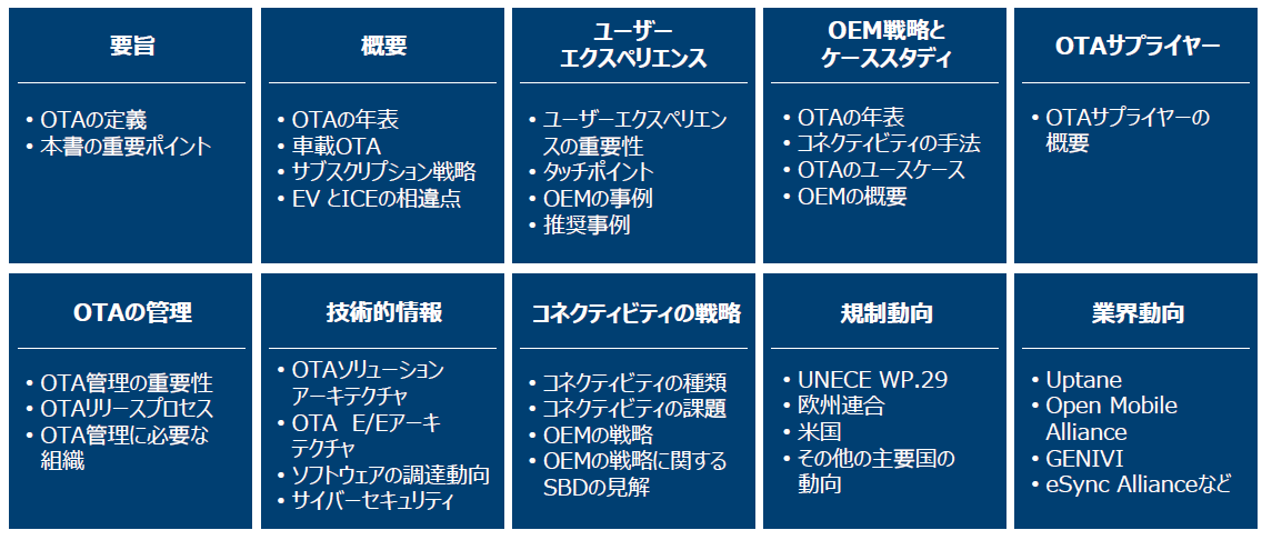 本書ではOTAアップデートが今後の自動車業界にどのような影響を及ぼすのかについて、OEMおよびサプライヤー双方の現在の活動と今後の展開、法規制や業界団体の動向、全般的なリスク、今後の動向などを含む全方位的観点から考察し、洞察を提供します。