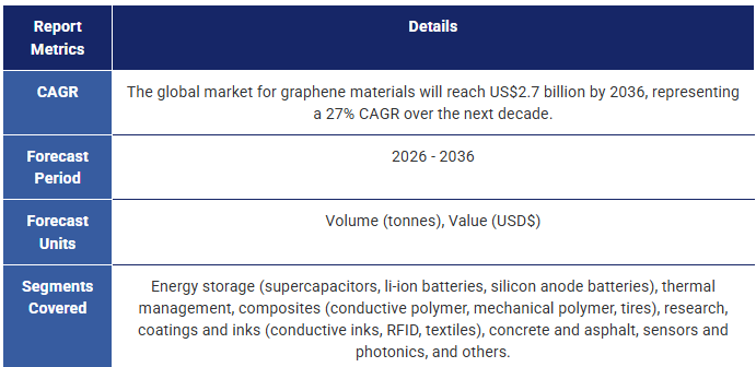 本レポートでは、グラフェン産業と 18 の応用分野それぞれについて、重要な市場情報を提供している。これには