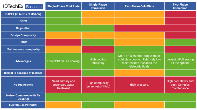IDTechExでは、データセンターの高性能化、ハイパースケールデータセンターの台頭、すぐに使える液冷ソリューションの入手可能性、高い柔軟性と後付け可能性、Nvidiaなどの大手企業が牽引する市場動向などの要因により、液冷の採用が急速に進むと予測している。特に、コールドプレート冷却は、費用対効果が高く、既存の空冷式データセンターとの互換性があるため、液浸冷却ソリューションに対応するための大規模な改修が不要であることから、最大の成長が見込まれる。