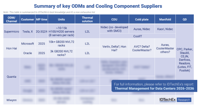 垂直統合の新たなトレンドの一つは、データセンターの冷却バリューチェーンに見られます。多くの液冷ソリューションサプライヤーは、バリューチェーン全体での協力体制の強化を提唱していますが、現在の状況は断片的で混沌としており、データセンターにあらゆるコンポーネントを統合するためには、システム統合による大規模な作業が必要です。IDTechExは、サーバーOEMが包括的なラックレベルの冷却ソリューションを提供し始めていることから、市場統合の潜在的な機会を特定した。これらのソリューションには、サーバー上のコールドプレート、サーバーラック、マニホールド、CDU、QDなどの重要部品など、さまざまなコンポーネントが含まれる。IDTechExはまた、液冷コンポーネントのサプライチェーンについてもまとめており、主要プレーヤーやその能力、バリューチェーンにおける企業間の連携などを掲載している。