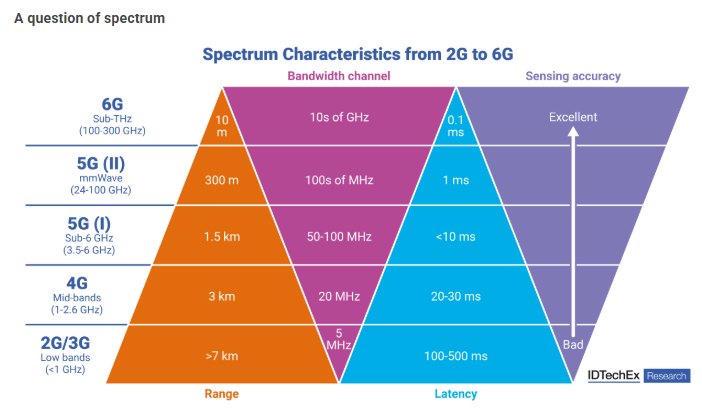 低帯域からサブTHz帯までの周波数特性の概要。一般的に、通信距離とデータ転送速度はトレードオフの関係にある。また、6GはSub-THz帯のみを使用するわけではなく、実際にはカバー範囲の大部分は中高周波数帯(7~15GHzのcmWaveなど)で提供され、より高い周波数は高密度ゾーン(スタジアムなど)で展開される見込みである。出典:IDTechEx:IDTechEx.