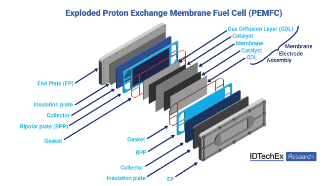 固体高分子形燃料電池(PEMFC)の分解模式図。個々の燃料電池部品と膜電極接合体(MEA)を示す。出典:IDTechExIDTechEx