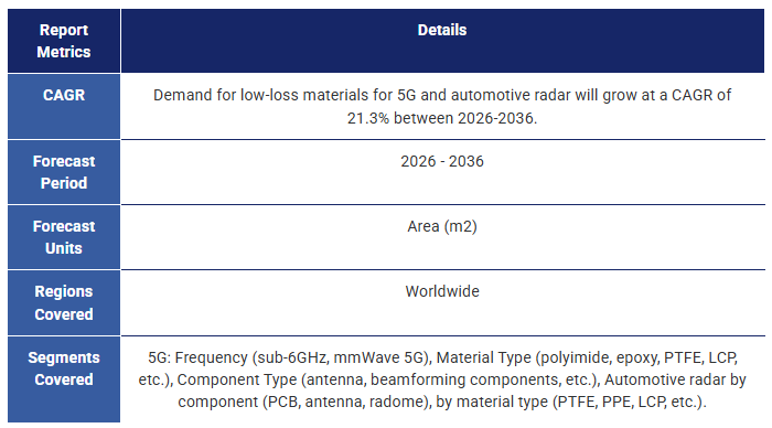 IDTechExのレポートは、低損失材料の需要を促進する主要技術と応用分野を調査し、市場動向の独立した包括的な分析を提供している。一次調査に基づき、業界動向の洞察、主要市場プレイヤーの分析、重要な材料性能特性にわたる製品のベンチマークを提供しています。また、アプリケーションと材料タイプ別に区分した10年間の需要予測も掲載しています。