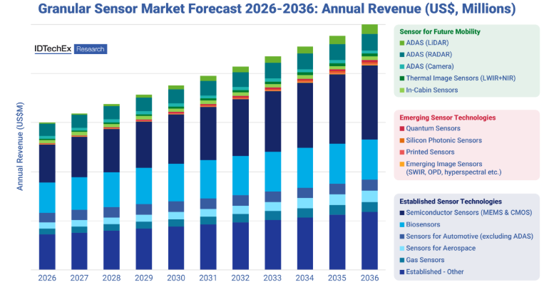 IDTechExは、フォトニック集積回路、量子センサー、プリンテッドセンサー、イメージセンサーの進歩が成長を促進するため、新興センサー技術は2036年までに年平均成長率17%で成長すると予測している。