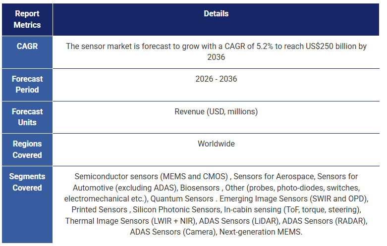 IDTechExは、モビリティ、AI、ロボティクス、6Gコネクティビティ、IoTの世界的なメガトレンドがセンサー需要を促進するため、世界のセンサー市場は2036年までに2500億米ドルに達すると予測している。IDTechExのセンサーレポートは、58社の企業プロファイルと20以上の関連センサーレポートから収集した洞察を含む、世界のセンサー市場の広範な分析を提供しています。IDTechExの広範なセンサーレポートポートポートポートフォリオを要約すると、この調査には、将来のモビリティ、IoT、ウェアラブル、バイオメディカル、エッジコンピューティング、環境センシングなどにわたる35以上のセンサー技術のSWOT分析、24の技術準備レベルのロードマップ、材料要件、サプライヤー情報が含まれています。このセンサー市場分析には、センサー技術別に区分された10年間のきめ細かなセンサー予測の更新が含まれています。