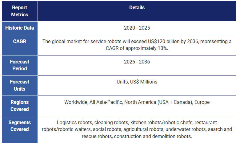物流・配送ロボット、ソーシャルロボット、清掃ロボット、農業ロボット、キッチンロボット、捜索・救助ロボット、建設ロボット、水中ロボットを含むサービスロボット産業の技術・市場評価