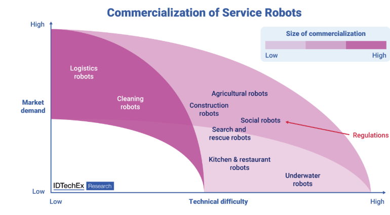 構造化された環境で動作する従来の産業用ロボットとは異なり、サービスロボットは日常的な環境で人と対話し、タスクを実行するように設計されている。その用途は、倉庫の自動化や接客サービスから農業や海洋検査まで多岐にわたる。商業化の段階はまだ用途によって大きく異なるが、長期的にはIDTechExは持続的な長期成長を予測している。IDTechExのレポートでは、これらのロボットをアプリケーションの成熟度、技術的難易度、市場促進要因に基づいて区分している。