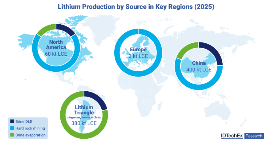 米州、欧州、中国のリチウム生産源:IDTechEx