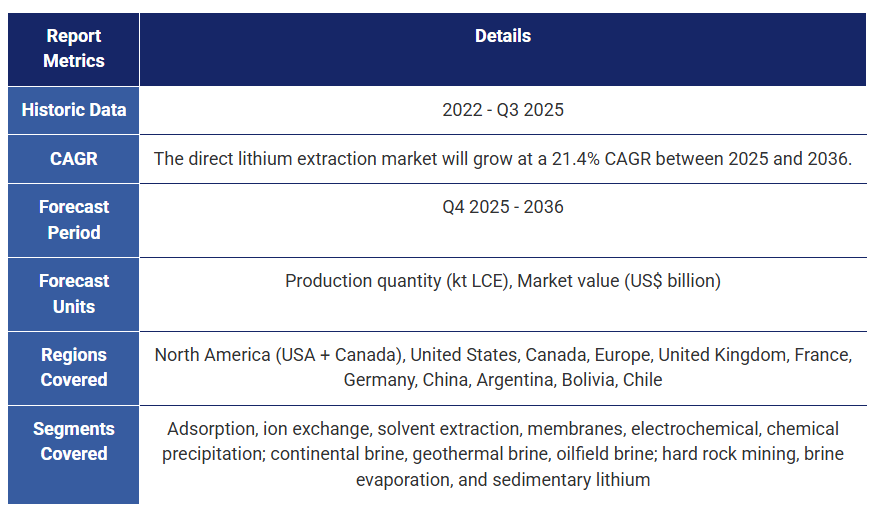 世界のリチウム市場について、供給源別の生産量(kt LCE)と市場価値(10億米ドル)の10年間のきめ細かな予測を提供している。供給源には、かん水DLE、かん水蒸発、硬岩採掘、堆積が含まれる。DLE市場については、技術別、ブラインの種類別、場所別の生産量(kt LCE)と市場価値(10億米ドル)の10年予測も示している。技術には、吸着、イオン交換、溶媒抽出、膜、電気化学が含まれる。ブラインのタイプには、大陸性、地熱、油田が含まれる。所在地には、アルゼンチン、ボリビア、チリ、米国、カナダ、英国、フランス、ドイツ、中国が含まれます。