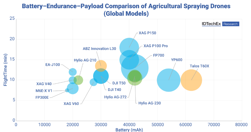 バブルの大きさはペイロード容量を示す:大きなバブルはより高い液体運搬能力を持つドローンを表す。色は原産地を示す:青=中国、緑=米国、オレンジ=欧州。