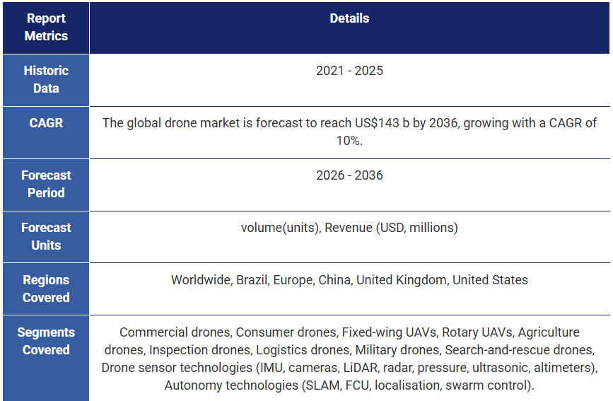 本レポートは、運用を形作る規制上の制約や各地域における展開の成熟度を含め、消費者、商業、防衛の各セクターにわたる世界のドローン産業の進展について包括的な概要を提供している。また、農業や検査からロジスティクスや公共安全まで、主要な用途で使用されるあらゆるセンシングとペイロードの構成を検証し、異なるコスト構造とミッション要件がプラットフォームの選択をどのように促すかを説明している。さらに、代表的な商業用ドローンのモデル、その技術仕様、センサースイート、価格帯、市場での位置づけの詳細なリストと、収益、出荷台数、センサーの統合動向を網羅した2026年~2036年の完全最新予測を掲載している。