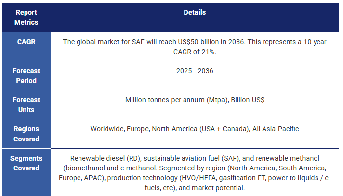 本レポートでは、再生可能メタノール、再生可能ディーゼル、SAFなど、様々な持続可能燃料の詳細な市場予測を提供している。再生可能ディーゼル、再生可能SAF、再生可能メタノールについて、生産地域(欧州、北米、南米、APAC)および技術経路(HEFA/HVO、ガス化-FT、power-to-liquids/e-fuelsなど)ごとに細分化した詳細な市場予測を提供する。詳細な技術分析から市場予測、プロジェクトケーススタディまで、本レポートはサステイナブル燃料市場を理解し、ナビゲートするために必要な洞察を提供します。