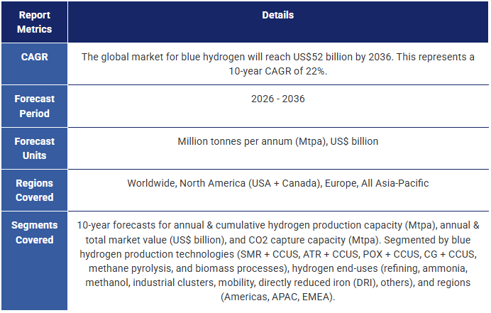ブルー水素は、世界の脱炭素化イニシアチブに牽引され、今後10年間で主要な低炭素水素製造経路として拡大が見込まれる。IDTechExは、世界のブルー水素市場が2036年までに年平均成長率(CAGR)22%で520億米ドルに達すると予測している。