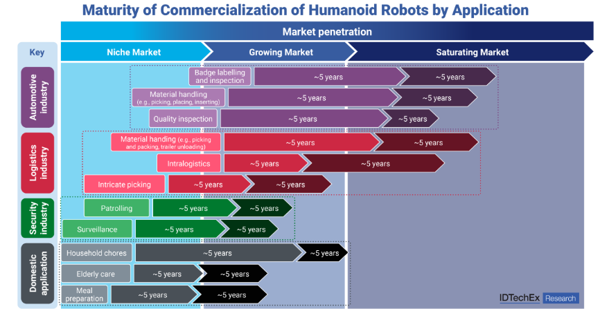 用途別ヒューマノイドロボット商業化の成熟度。詳細データはIDTechEx調査報告書「Humanoid Robots 2026-2036: Technology, Market, and Opportunities」を参照