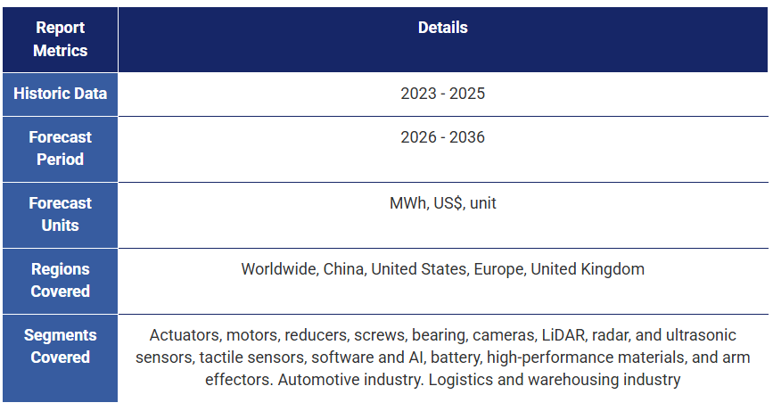 本レポートは、ヒューマノイドロボットの主要用途と各構成要素の技術的・規制的・商業的課題に焦点を当てた重要な市場情報を提供する。内容は以下の通り: