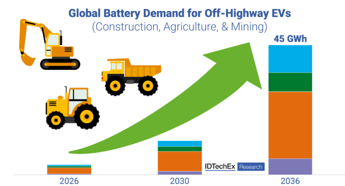建設、農業、鉱業用機械による世界のバッテリー需要は、2036年までに45GWhに達する見込み(出典:IDTechEx)