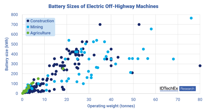 オフハイウェイEVは稼働重量が大きく異なるため、あらゆる機械タイプでの電動化を成功させるには、幅広いサイズのバッテリーが必要となる。出典:IDTechEx