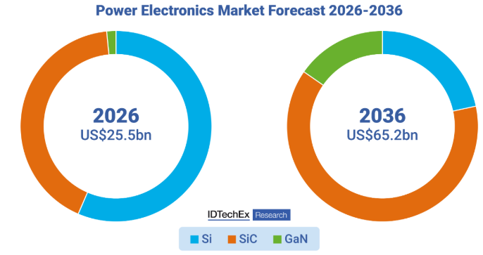 2036年までにSiCがパワーエレクトロニクス産業の過半数のシェアを占める見込みであり、今後10年間でGaNパワーエレクトロニクスの採用が大幅に拡大する。