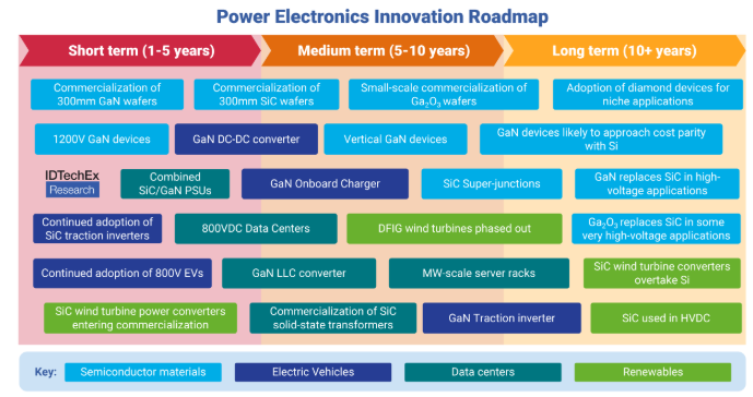 Si、WBG、UWBG向け半導体材料における技術革新、ならびに電気自動車、データセンター、再生可能エネルギー分野におけるイノベーションに関する短期、中期、長期のロードマップ。
