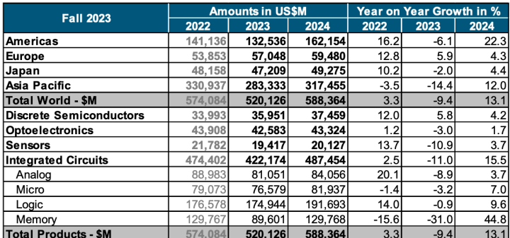 2023年にはいくつかの半導体製品分野が目立った。ロジック製品の2023年の売上高は1,785億ドルとなり、売上高で最大の製品分野となった。メモリー製品の売上高は923億ドルで第2位であった。マイクロコントローラー・ユニット(MCU)は11.4%増の合計279億ドル。また、車載用ICの売上高は前年同期比23.7%増の422億ドルとなり、過去最高を記録した。