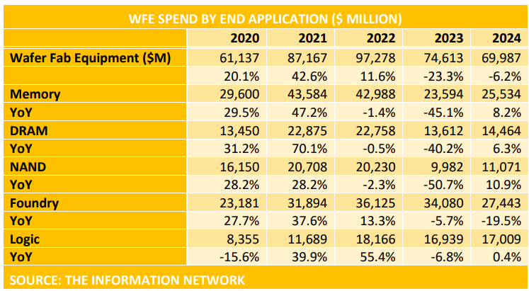 2020年から2024年にかけての最終製品別ウェーハフロントエンド装置投資額を以下に示す