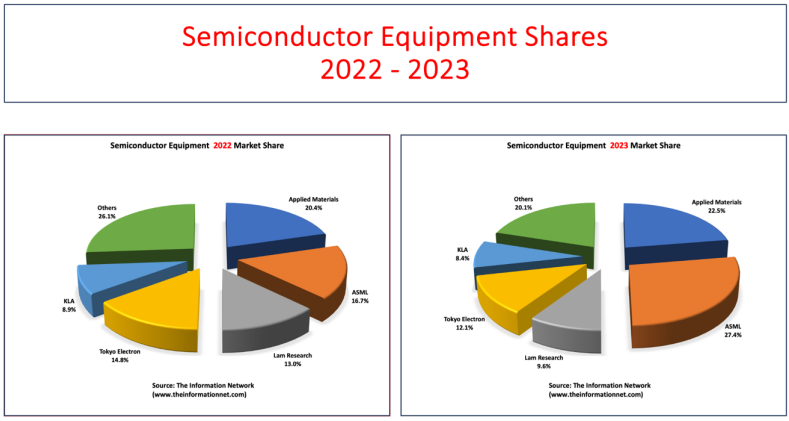 以下の図1.1では、2022年と2023年の世界WFE装置市場の市場シェアを示しており、世界の装置企業トップ5とその他の装置企業のシェアを掲載している。