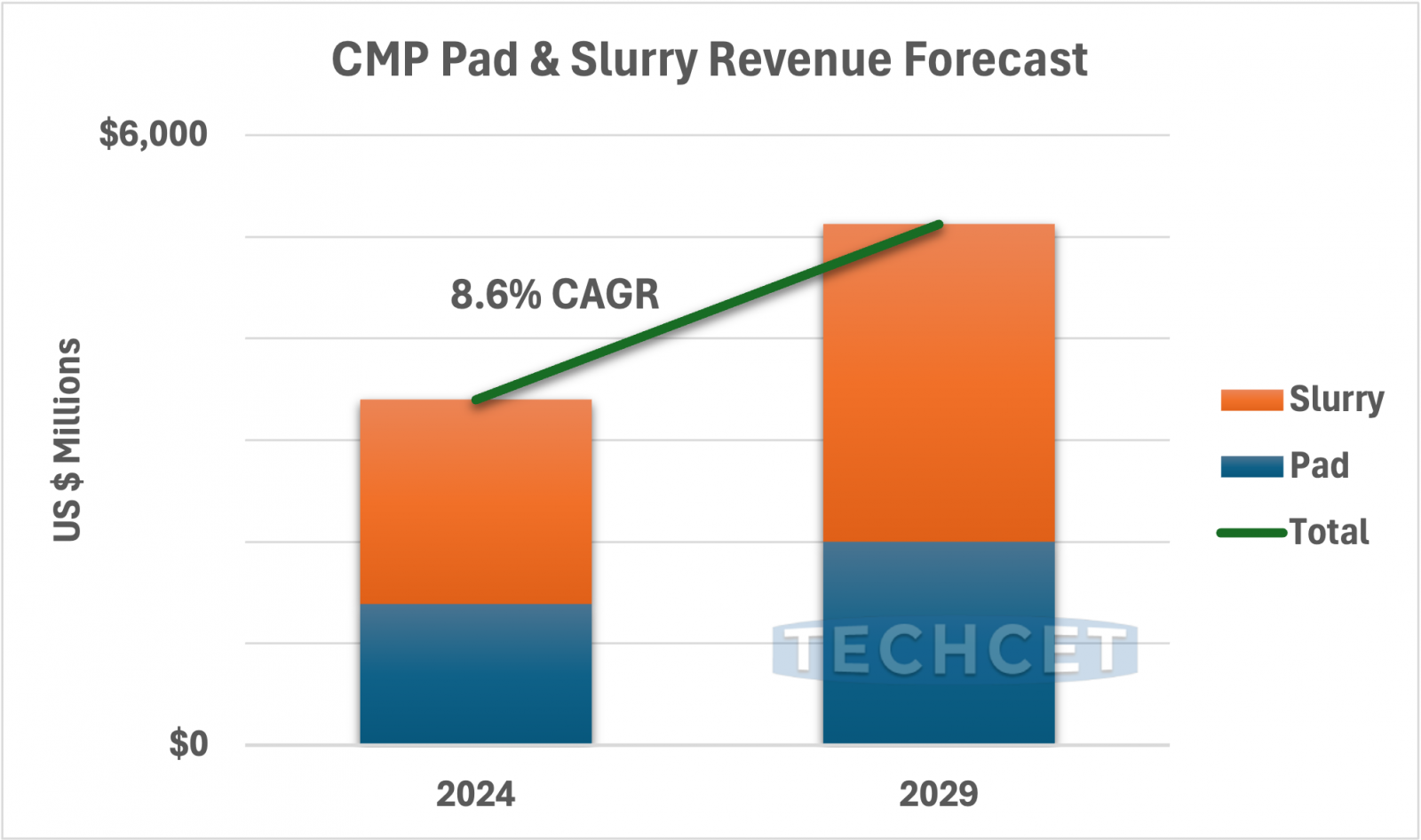 TABLE 3.1: GLOBAL GDP AND SEMICONDUCTOR REVENUES Press ReleaseNovember 5, 2025 | Press Pelease CMP Slurry and Pads Market Set for 6% Growth in 2025San Diego, CA, November 5, 2025: TECHCET, the CMP slurry and pad market is forecasted to grow 6% in 2025 to approximately $3.6 billion USD, driven by recovery in logic segments, and expanding CMP process steps across next generation device technologies and advanced packaging. Slurries are expected to total $2.14B and pads $1.46B, together reflecting a CAGR of 8.6% through 2029. Growth is being fueled by advanced 3D NAND, FinFET 3nm, GAA, and emerging backside power delivery structures, all requiring more CMP steps per wafer to achieve superior planarity and performance according to TECHCET’s 2025-2026 Critical Materials Report on CMP.