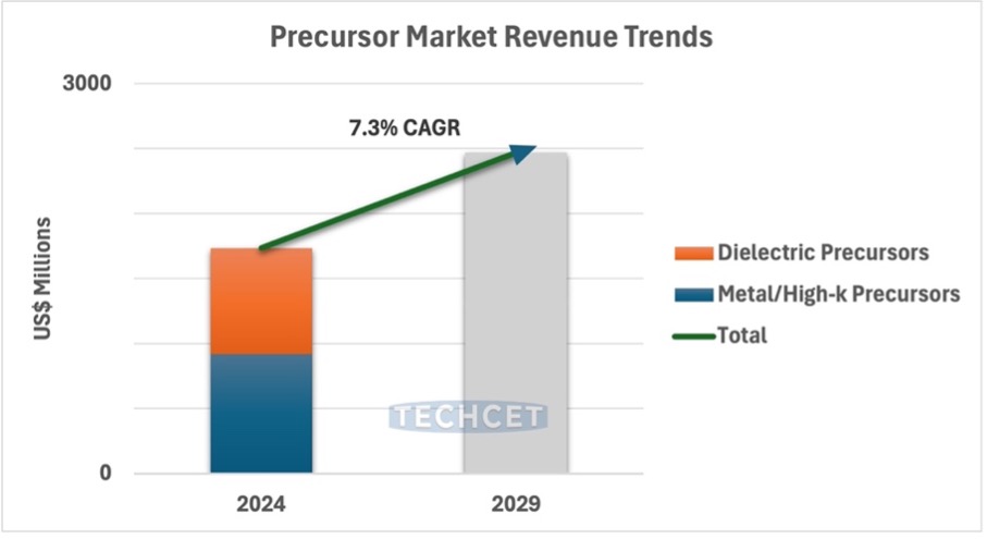 TECHCET, the electronic materials advisory firm providing semiconductor materials supply chain information, reported strong momentum in the ALD/CVD dielectric and metallization precursors. Revenues for dielectric precursors rebounded in 2024 with an 18% increase, while metallization precursors are expected to post 11% YoY growth from 2025 to 2026. Looking longer term, 2024–2029 CAGRs are forecast at 9% for dielectrics and 7% for metals, according to TECHCET’s 2025-2026 Critical Materials Report(TM) on ALD/CVD Precursors.