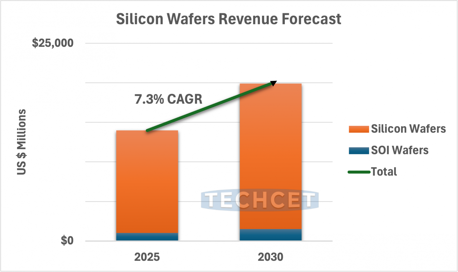 TECHCET, reports after challenging years, the wafer industry is forecasted to see stronger growth for the remainder of 2025. Shipment volumes are expected to have risen +5%, driven largely by increasing demand for 300mm wafers in 2025. Revenue is projected to increase nearly 4% to USD $14.0B, with both silicon and SOI wafers contributing to the gain. Looking ahead, shipment 5-year CAGRs is +7% according to TECHCET’s 2025-2026 Critical Materials Report on Silicon Wafers.