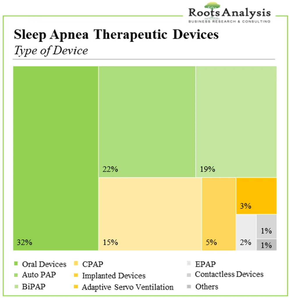 治療用デバイスの大半(32%)は経口デバイスであり、AutoPAPデバイス(22%)、BiPAPデバイス(19%)、CPAPマシン(15%)がこれに続く。気道陽圧装置(CPAP装置、BiPAP装置、AutoPAP装置を含む)は、睡眠時無呼吸症候群の治療に最も広く使用されている標準的な選択肢であることは注目に値する。睡眠時無呼吸症候群の治療機器を提供している企業としては、フィッシャー・ペイケル(fisher paykel)、ナスメディカル(natus medical)、ソムネティクス・インターナショナル(somnetics international inc. ドーミオ(レスポ・ガジェット社が開発)は、気道圧と顎と舌の安定化技術に働きかけることができる唯一の経口装置であることは注目に値する。