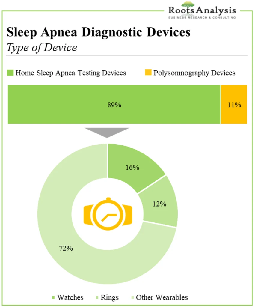 診断機器の大部分(89%)は家庭用睡眠時無呼吸検査機器(HSAT)である。患者の間で家庭用睡眠時無呼吸検査装置の人気は最近着実に高まっている。これは主に、このような装置が睡眠時無呼吸症候群をモニターし診断するための便利で費用効果の高い方法を提供し、患者が自宅で快適に過ごせるという事実に起因している。さらに、HSAT装置のうち、大多数(23台)は非侵襲性のウェアラブル装置である。