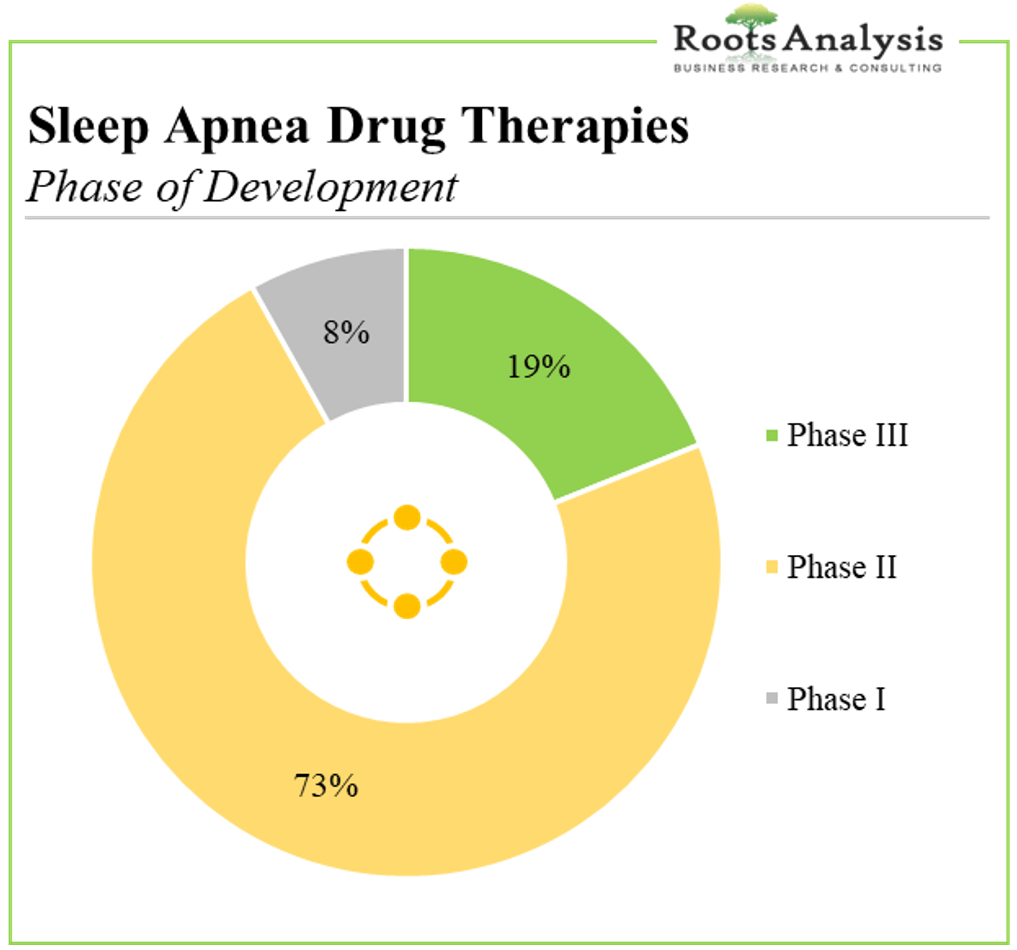 睡眠時無呼吸症候群の治療を目的とした治療法の大部分(73%)は第II相臨床試験で評価されている。次いで、臨床開発の第III相で研究されている治療法(8%)である。興味深いことに、第II相の治療法のほとんどが閉塞性睡眠時無呼吸症候群を対象として研究されている。