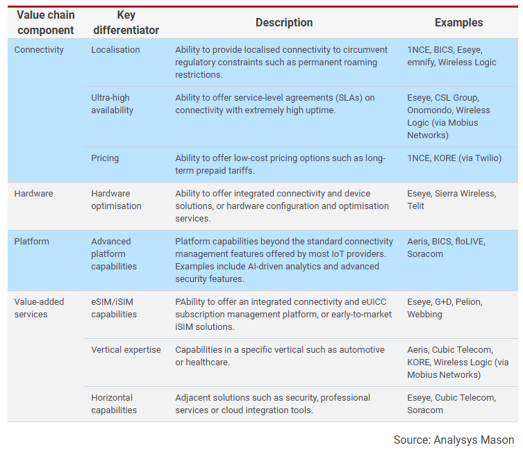 図1は、IoTバリューチェーンの主な構成要素の概要と、各構成要素における差別化要因の例を示している。差別化要因の中には、競合他社が容易に模倣でき、短期的な優位性をもたらすものもあれば、模倣が難しいものもある。例えば、多くのプロバイダーは、プリペイド料金プランを開始することができ、また、eSIM/iSIMソリューションを開発するために提携することもできる。超高可用性接続の実現は、冗長性とフェイルセーフ・メカニズムを構築するためのネットワーク投資、および/またはSIM上のインテリジェント・ソフトウェアに依存するため、より困難である。垂直的な専門知識は通常、買収によって達成される。すべてのプロバイダーがこの道を歩むためのリソースやリスク許容度を持つわけではない。
