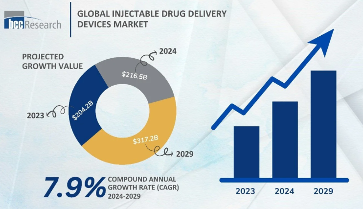 注射用薬物送達デバイスの世界市場は、かつてない成長を遂げています。BCCリサーチによると、この市場は2024年の2165億ドルから、2024年から2029年の年平均成長率(CAGR)7.9%で成長し、2029年には3172億ドルに達すると推定されています。