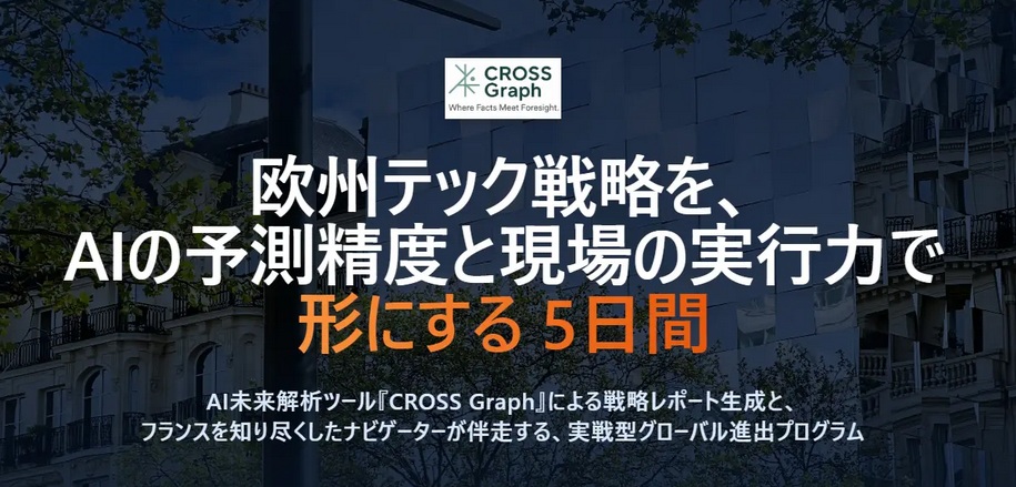 弊社の親会社CROSS Business Producers株式会社が提供するAIインテリジェンスプラットフォーム「CROSS Graph」と連動し、新しい視野を獲得するため、世界最大級のスタートアップ・テクノロジーカンファレンス VivaTech 2026 (開催期間:2026年6月17日〜20日/フランス・パリ) への訪問を含む、2050年未来予測 実践型プログラム「欧州テック最前線ラボ 2026 in Paris」(仮称) の募集を開始いたします。